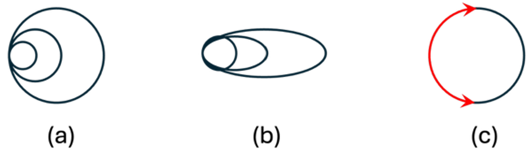 If we are only allowed to grow the torus at one location while keeping other parts intact, the geometry becomes (b). This procedure can be carried out strictly in 2d (in a bilayer 2d system), but one essentially gets a “folded” chiral state, because the top and bottom halves of the torus are close together. Therefore, we should think of this state as a stack of two states with opposite chiralities, and not a chiral state.