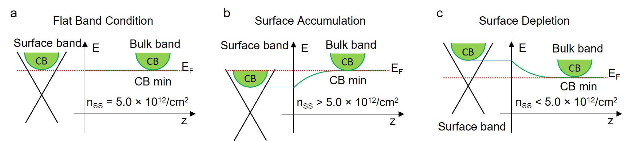 The flat band condition can be understood from the attached Figure 1. Given that the Mott criterion fixes $E_F$ to be at the conduction band minimum (confirmed by previous report) and knowing the surface state carrier density, together these fix the band bending as follows. First, assume that at the surface $E_F$ barely touches the CB minimum. Then assuming a Fermi velocity (4.0 *$10^5$ m/s) and the energy of the CB minimum relative to the Dirac point (210 meV), the surface carrier density can be calculated for one surface to be $n_{SS}$=5.0*$10^{12}$/$cm^2$ by the formula given on Page 12 and 13. Since EF at the surface and in the bulk is at the CB minimum, the bands must be flat, and band bending is negligible (see attached Figure 1). Therefore, $n_{SS}$=5.0*$10^{12}$/$cm^2$ gives the flat band condition. Either a higher or lower carrier density would give rise to an accumulation or depletion of carriers and band bending near the surface.