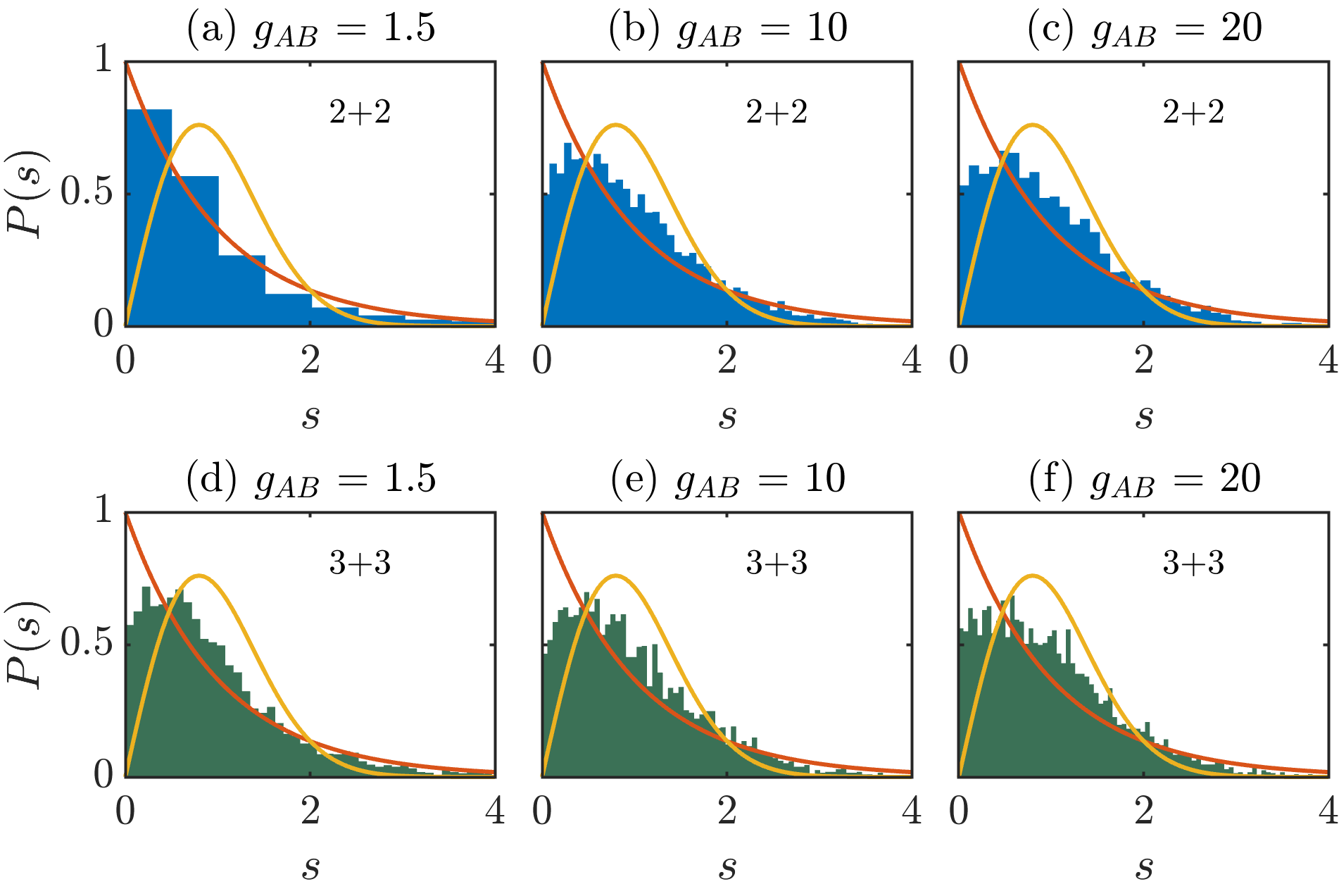 1- Add a level spacing statistics histogram for $g_{A} = g_{B} = g_{AB} = 10$ and compare it to the $g_{A} = g_{B} = 10, g_{AB} = 1.5$ and $g_{A} = g_{B} = 10, g_{AB} = 20$ histograms;