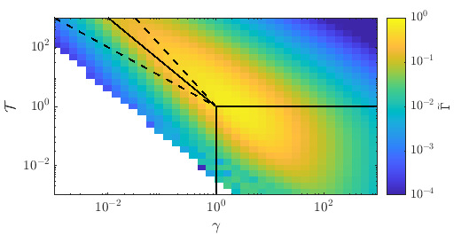 However, we agree that the exact construction of the measure indeed does appear a bit arbitrary: In our previous response, we stated that defining a measure $\tilde \Gamma = \frac{1}{n} \int_{-\infty}^{\infty} \mathrm{d}\theta \: \rho_{\mathrm{p}}(\theta) \frac{\delta \bar z^2 (\theta)}{\bar z (\theta)}$, i.e. with the ratio of ballistic distance to diffusive width inverted, would "produce an equivalent measure" to $\Gamma$. This formulation was rather poor: Of course, $\tilde\Gamma$ is not equal to $\Gamma$, however, from analysing either function one will arrive at similar conclusions regarding which regimes diffusive the most/least, as the location of their extrema in the $(\gamma, \mathcal{T})$-phase-space coincide. To verify this, we have calculated $\tilde\Gamma$ for thermal states at various $\mathcal{T}$ and $\gamma$ (for $c =1$, see attachment). Note, that we omitted calculating the measure deep in the quasi-condensate regime, as high rapidity resolution (and thus large numerical computation time) is needed for proper convergence of the thermal state. Comparing the attached plot of $\tilde\Gamma$ to the plot of $\Gamma$ found in the manuscript, we indeed observe the same qualitative features, namely that the most diffusive thermal states are found around $\mathcal{T} \sim 1$ and $\gamma \sim 1-10$, that diffusive contributions become vanishingly small in the asymptotic regimes, and that for higher temperatures diffusion is most prominent near the transition between the quasi-condensate and ideal Bose gas regimes.