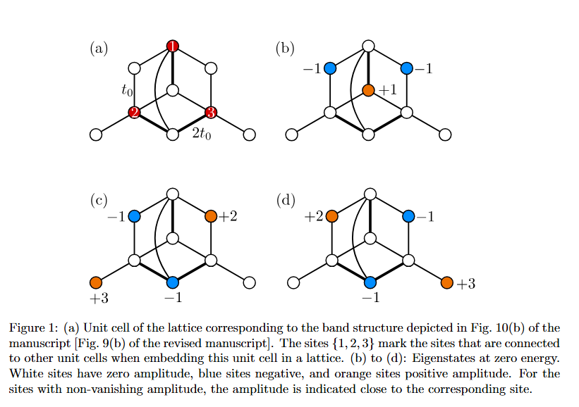Response: The flat band at zero energy can be explained purely from an analysis of the unit cell, which we depict in Fig. 1(a) of this report again for convenience. For any value of t0, the cell supports three states that all have zero energy and vanish on the red sites {1, 2, 3}; these states are depicted graphically in Figs. 1(b) to (d). States with the characteristic of perfectly vanishing at some sites are known in the literature as “compact localized states” (see, for instance, the Review “Artificial flat band systems: from lattice models to experiments” by Leykam et al., Advances in Physics: X 1473052, 2018). Since these states all vanish on the sites {1, 2, 3} that connect the given unit cell to other unit cells in the lattice, it can be easily shown that the full lattice also features a zero energy eigenstate that is at least 3N-fold degenerate, with N being the number of unit cells. These 3N states can then be superposed to form Bloch states, and lead to three flat bands at zero energy.