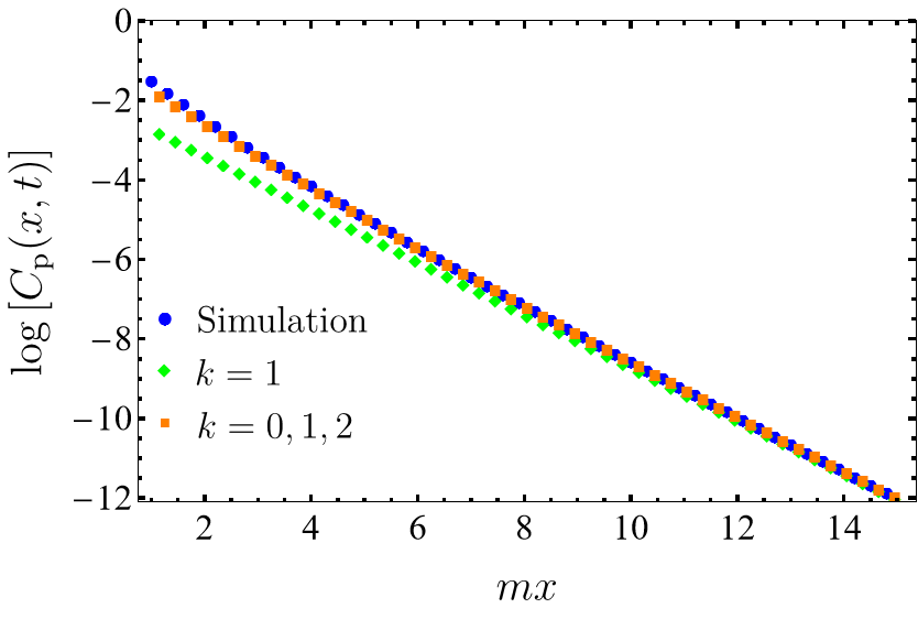 Thank you for this thoughtful question. The non-analyticity indeed stems from the switch between the leading exponential terms. However, it only arises when taking the limit x→ $\infty$ asymptotic limit, so finding a clear crossover behavior between the two leading exponentials in a finite regime is challenging. The correlators themselves are smooth functions of the ray parameter. Regardeless, one could investigate whether including more sub-leading terms in the expansion improves the approximation and smoothens the transition. To explore this, we performed additional simulations at $m\beta = 5$ and $\zeta = 0.75$, where the leading term corresponds to $k_0 = 1$ (see Eq. (5.13)). The attached plot shows the simulated data, the leading decay corresponding to this $k = 1$ value, and a refinement including the $k = 0$ and $k = 2$ terms as well. We can clearly see that keeping more terms makes the approximation better for smaller mx values, which might be phrased as a crossover in the spatial separation.