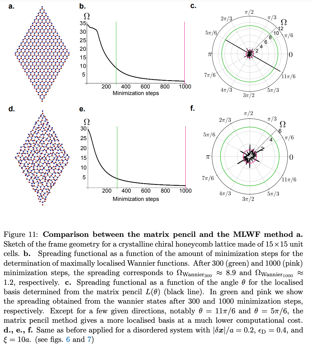 1) The pencil matrix method to estimate the Wannier centers without performing the costly optimization of the spread functional is of great interest to the community. However, whether this method is generally applicable is a highly nontrivial question, that the manuscript does not address, beyond comparing the results in a few specific cases and finding good agreement. Besides a strong argument for the method's applicability missing (with reference 51 to an entire book being too vague), it is also unclear what exactly the method is. I thank the authors for making their Mathematica code available, however, this code only calculates results for a single choice of α's, while the results in the manuscript are obtained by averaging over an ensemble. What is the distribution the α's are drawn from? How are the position eigenstates for various α values matched while averaging? Considering that one choice of α's corresponds to calculating the projected position eigenvalues along one randomly chosen axis, it is not obvious which eigenstate corresponds to the same Wannier center in a large sample for different choices of α's.