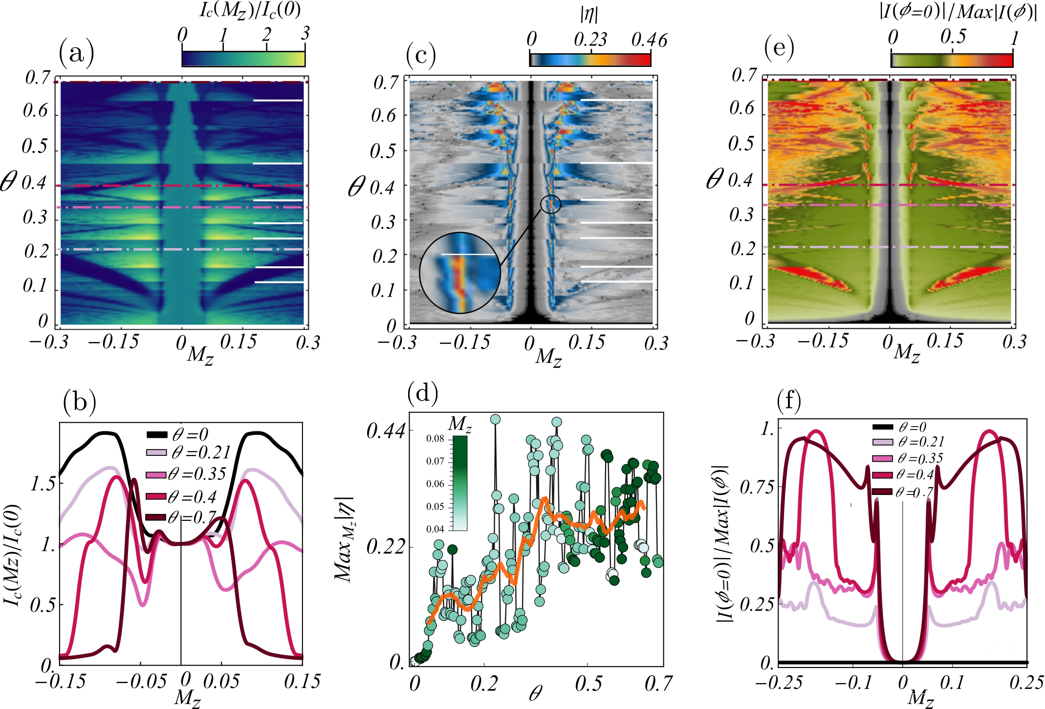 5 - The authors discuss properly and extensively the diode effect efficiency $\eta$ and the $I(\phi=0)$ behavior when tuning the kink-angle $\theta$ and the magnetic field $M_{z}$.