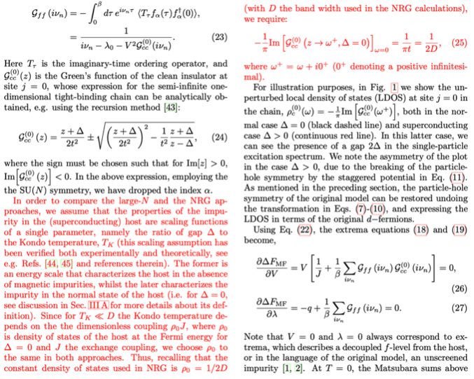 both calculations, i.e. \rho_0 = 1/(\pi t) = 1/2D, where t is the hopping element in the effective TB model and D is the NRG band-width. Thus, I would have expected that for the comparison they choose a ratio D/t such that \rho_0\Delta is the same in both calculations. However, taking the values indicated in Fig. 4(a) I find \rho_0\Delta= 0.0005 in the NRG calculation, and \rho_0\Delta = 0.005/\pi for the large-N one. There might be some misunderstanding from my side but in any case it would be worth that the authors could clarify this issue in their manuscript.