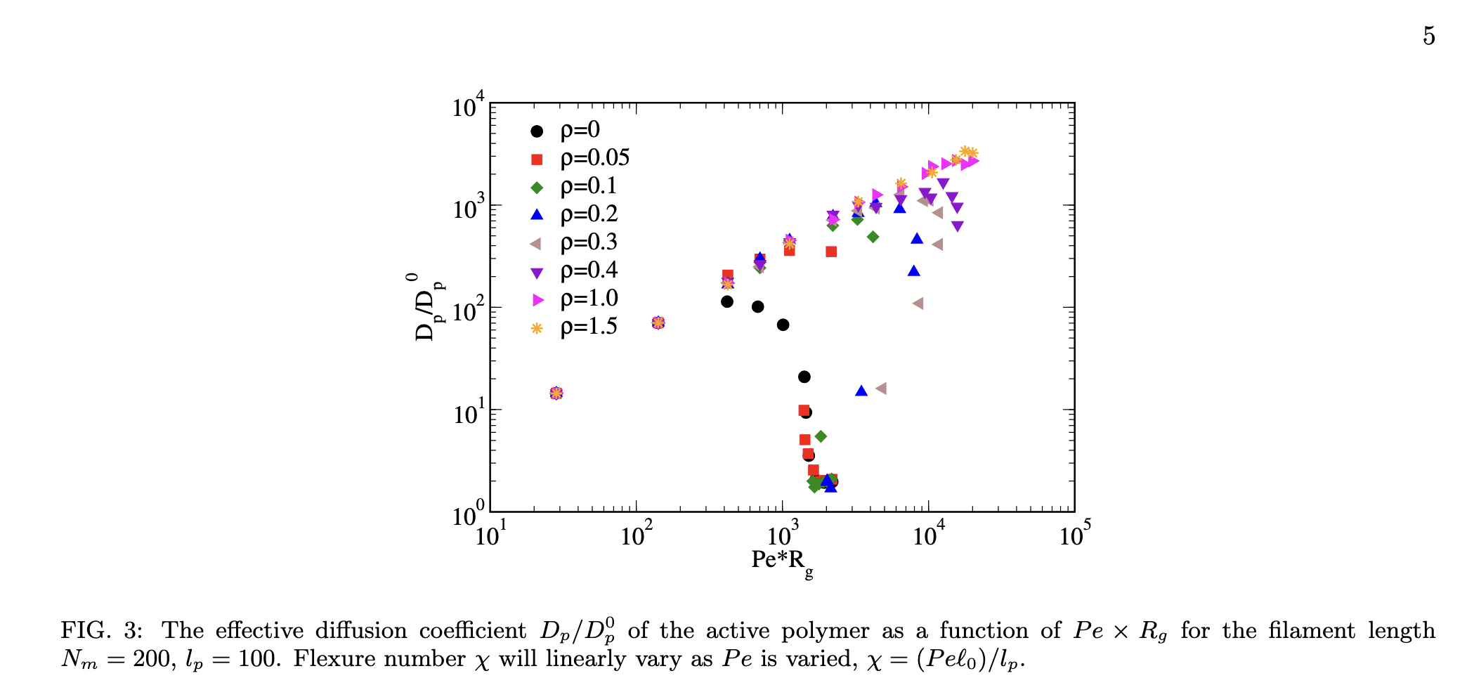 - the results are typically presented in units of the microscopic Peclte number Pe = fl/k_BT. However, in a recent contribution (Molecular Physics, e2384462, 2024), it has been shown that the data can be better understood by looking at a macroscopic Peclet number Pe = f R_G/k_BT. I wonder if this can be the case here as well. For example, I wonder if the reduction in R_E shown in Fig.5a can explain the reduction in the effective diffusion shown in Fig.8.
