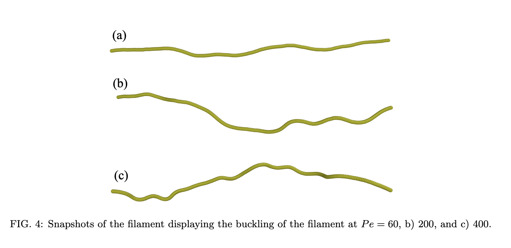 Comment: The authors obtain a power law relationship $R_{\beta} \sim Pe^{-\beta}$, a relationship between a length and a dimensionless number. I hope this relationship holds regardless of the filament discretisation into finite number of beads. The question arises what sets the lengthscale at fixed $Pe$? In other words, would $R_{\beta}$ scale as persistence length or total filament length or some other quantity?